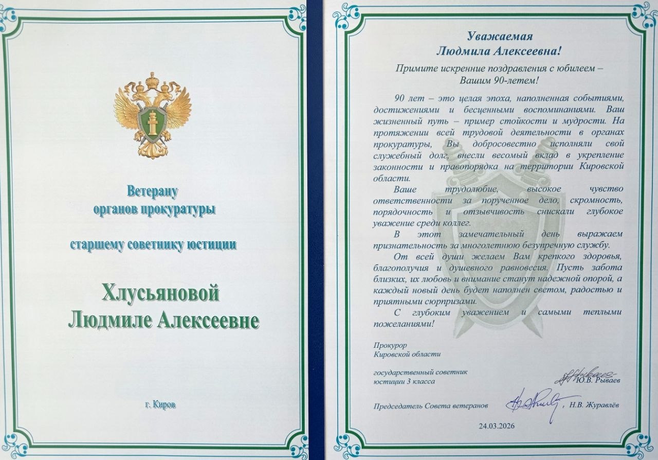 Ветеран прокуратуры Кировской области Людмила Алексеевна Хлусьянова отмечает свой 90-летний юбилей