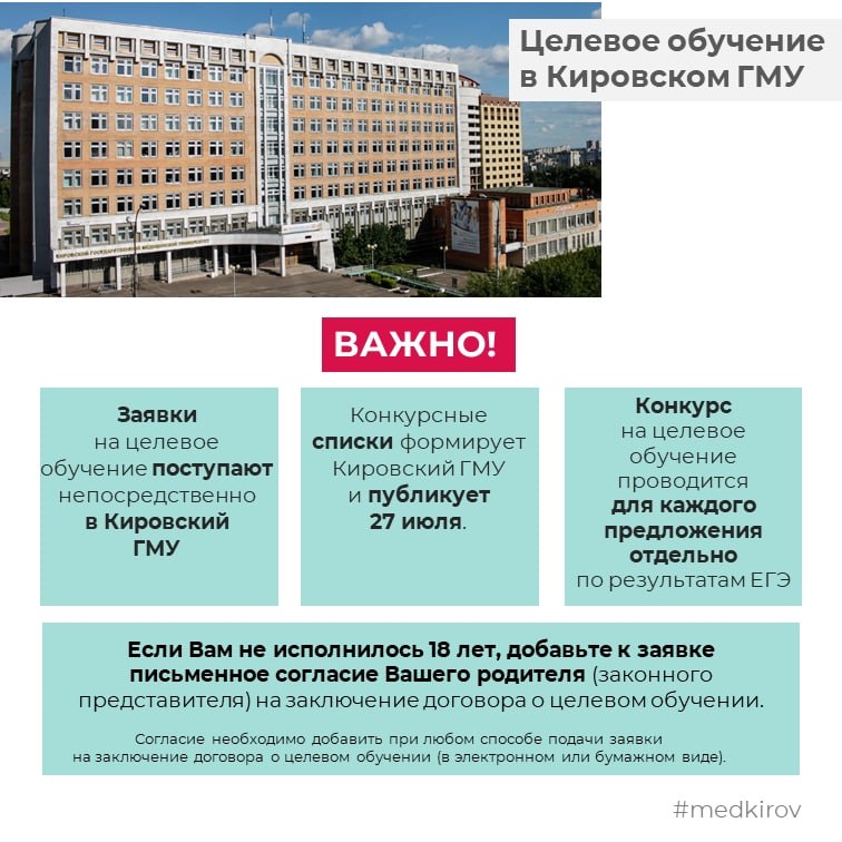 Кировский государственный медицинский университет — ведущее образовательное учреждение региона, которое готовит кадры для учреждений здравоохранения. Абитуриенты могут заключить договоры на целевое обучение в КГМУ.