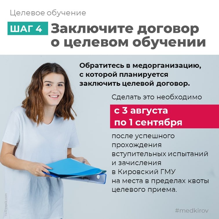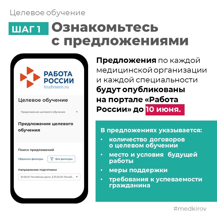 Медицинские организации формируют на портале «Работа России» предложения о заключении договоров о целевом обучении, а абитуриенты подают заявки на заключение договора. Сам договор о целевом обучении заключается после опубликования списков поступивших. Предложения по каждой медицинской организации будут опубликованы на портале до 10 июня.
