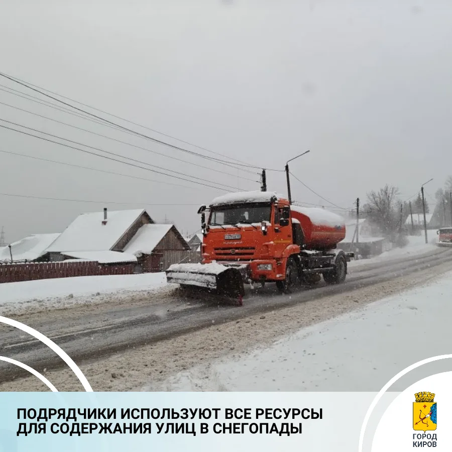 В Кирове продолжаются снегопад и метель. Подрядные организации, выполняющие работы по содержанию улично-дорожной сети, вывели на улицу всю имеющуюся технику, которая еще не переоборудована для работы в летний сезон.
