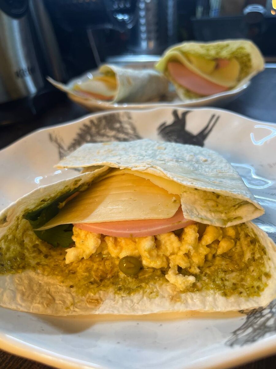 Для начала, следует намазать лаваш песто. Затем сверху добавляется болтунья из двух яиц и нескольких ложек молока, обжаренная на сковороде с постоянным помешиванием. Это помогает достичь нежной и кремовой текстуры, которая приятно плавится во рту.