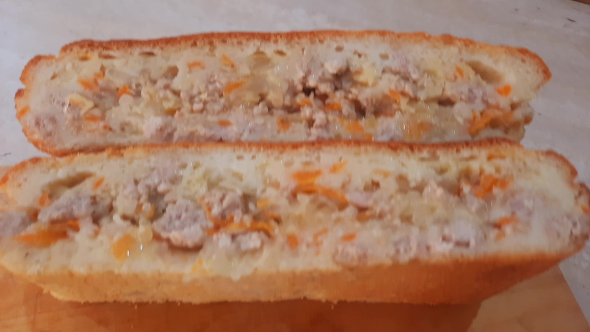 - Форму (22x16 см) смазываем сливочным маслом. Выливаем половину теста, сверху выкладываем начинку и закрываем оставшимся тестом. Разравниваем.