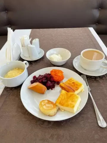 Сегодня начинался с прекрасного завтрака, в который вошли два куска аппетитной творожной запеканки, нежный оладушек, сарделька, а также морковная котлета. На столе также были свёкла и пшенная каша, которую не удалось съесть полностью. Завтрак завершился творогом с добавками и чашечкой кофе с молоком, а также чашкой чая с ложечкой вишневого варенья.