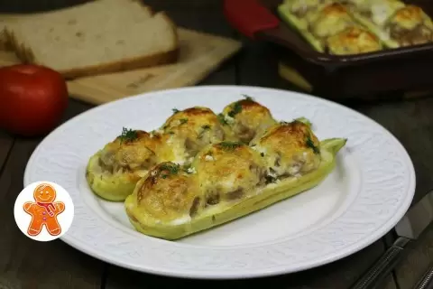 Полученной фарш наполняются подготовленные лодочки из кабачка, после чего каждую порцию можно посыпать тертым сыром. Блюдо помещается в заранее разогретую духовку и запекается до золотистой корочки.