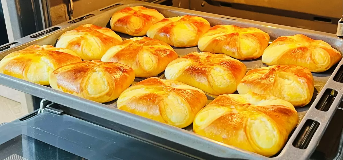 Когда тесто будет готово, его раскатывают в прямоугольный пласт толщиной около пяти миллиметров и нарезают на двенадцать частей. В центр каждой из них выкладывается начинка, после чего тесто складывается в виде конверта. Заготовки оставляют на 30 минут для расстойки, а затем выпекаются в предварительно разогретой духовке при температуре 180 градусов на протяжении 25 минут. Как только ватрушки готовы, их стоит подавать к столу горячими — они разлетаются со стола в считанные минуты!
