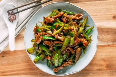Разогрейте вок или сковороду на сильном огне до появления легкого дымка и добавьте 1 ст. л. масла. Выложите замаринованную свинину и обжаривайте, помешивая, в течение 2–3 минут до золотистого цвета. Затем переложите свинину на тарелку. В сковороду добавьте оставшуюся ложку масла, имбирь, чеснок и перцы, обжаривая их около минуты, пока они не начнут бурлить и слегка подрумяниваться. Следующий шаг — верните мясо обратно, добавив немного шаосинского вина для деглазирования. Смешайте с сахаром и темным соевым соусом, обжаривая все вместе еще пару секунд на сильном огне.
