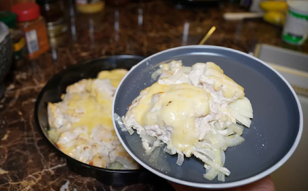 И вот, запеченная грудка индейки с луком и сметаной готова! Приятного аппетита!