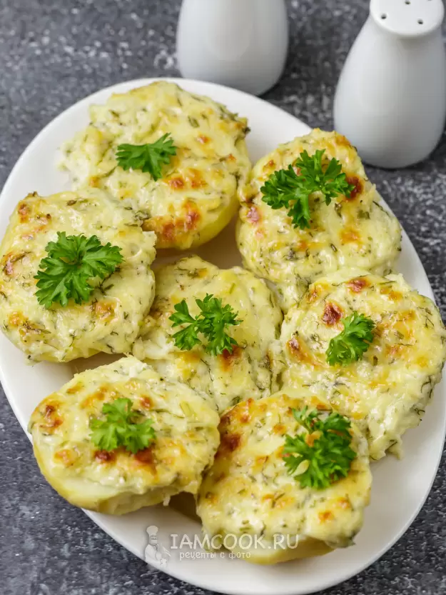 Сборка блюда. После охлаждения картофеля удалить кожуру (если это необходимо) и разрезать пополам. Уложить картофель срезом вверх на противень, слегка посолить и аккуратно покрыть сырной начинкой.