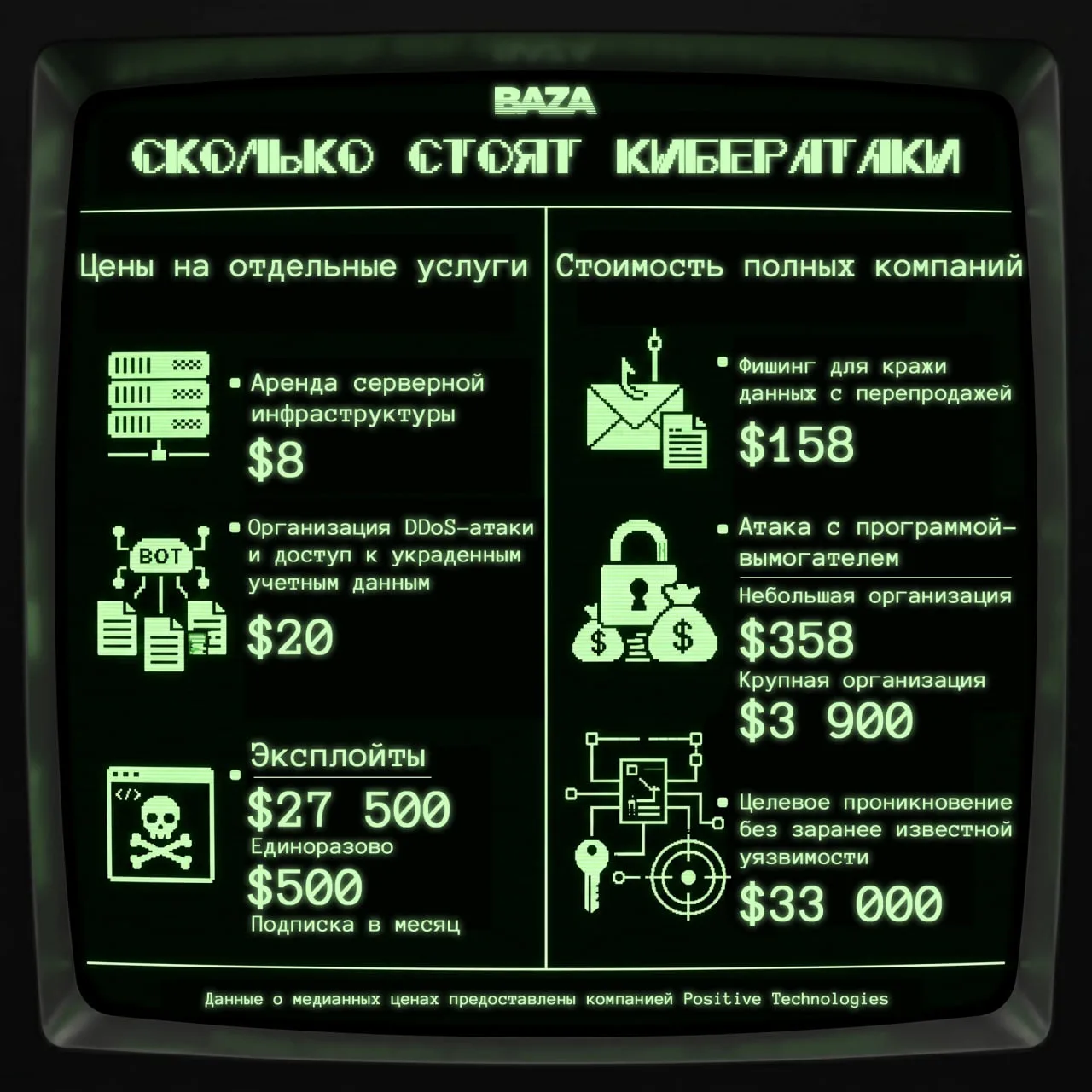 Эксперты компании по кибербезопасности Positive Technologies рассчитали примерную стоимость готовых кейсов кибератак — с учётом всех используемых инструментов и сервисов. Фишинговая кампания для кражи корпоративных учётных данных с последующей их перепродажей обойдётся примерно в 158 долларов и окупается уже с первого полученного доступа. Атака с программойвымогателем на небольшую организацию стоит 358 долларов, а на крупный бизнес — около 3 900 долларов. Проникновение в критически защищённую инфраструктуру с использованием ранее неизвестной уязвимости оценивается примерно в 33 000 долларов.