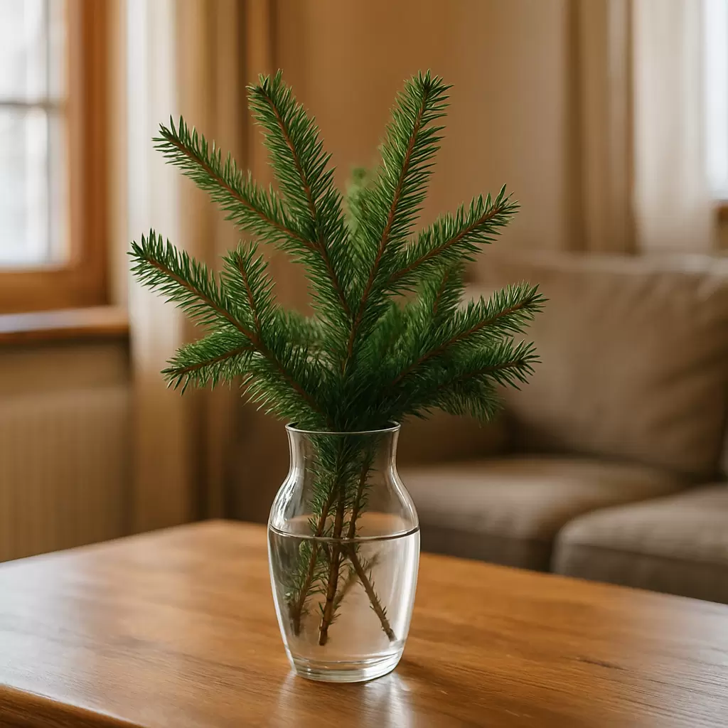 Пусть веточка еловой или сосновой ветви стоит в широкой вазе: она испаряет влагу через хвою, автоматически регулирует баланс воды и отдает влагу в воздух без перегрева и шума. Эффект ощущается уже в первый день: воздух становится мягче и спокойнее.