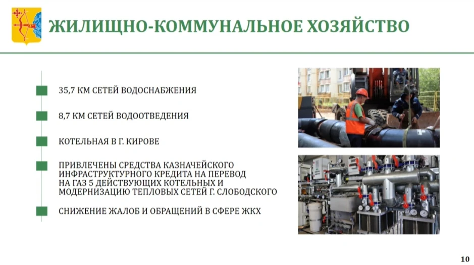 — В 2025 году проведен капитальный ремонт сетей водоснабжения в пгт Восточный Омутнинского района, а также сетей водоснабжения и водоотведения на территории г. Кирова. Это позволило отремонтировать более 35.7 км сетей водоснабжения и 8.7 км сетей водоотведения. Построена котельная в г. Кирове.