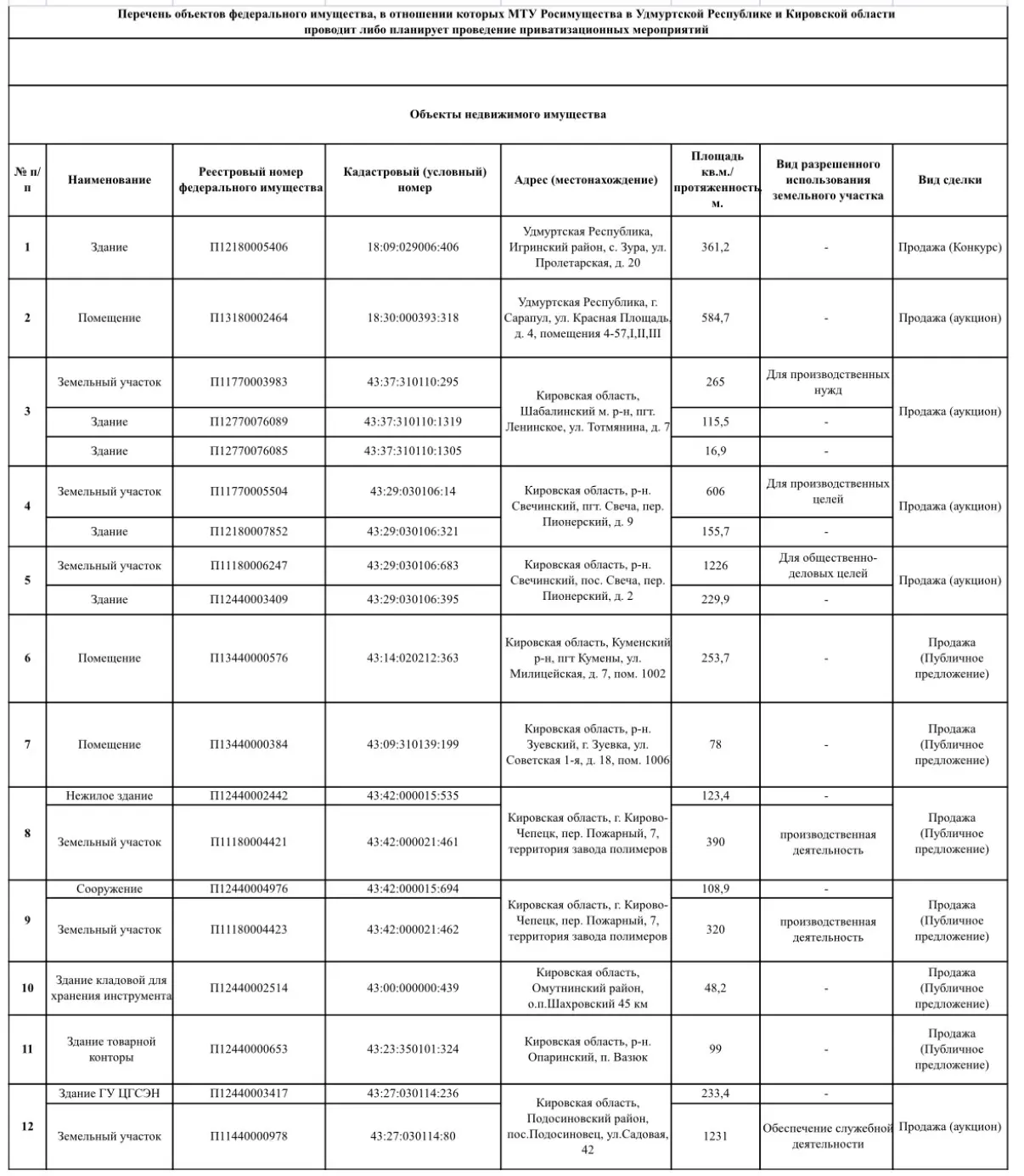 МТУ Росимущества в Удмуртской Республике и Кировской области приглашает потенциальных покупателей на мероприятие по ознакомлению с федеральным имуществом, подлежащим продаже.